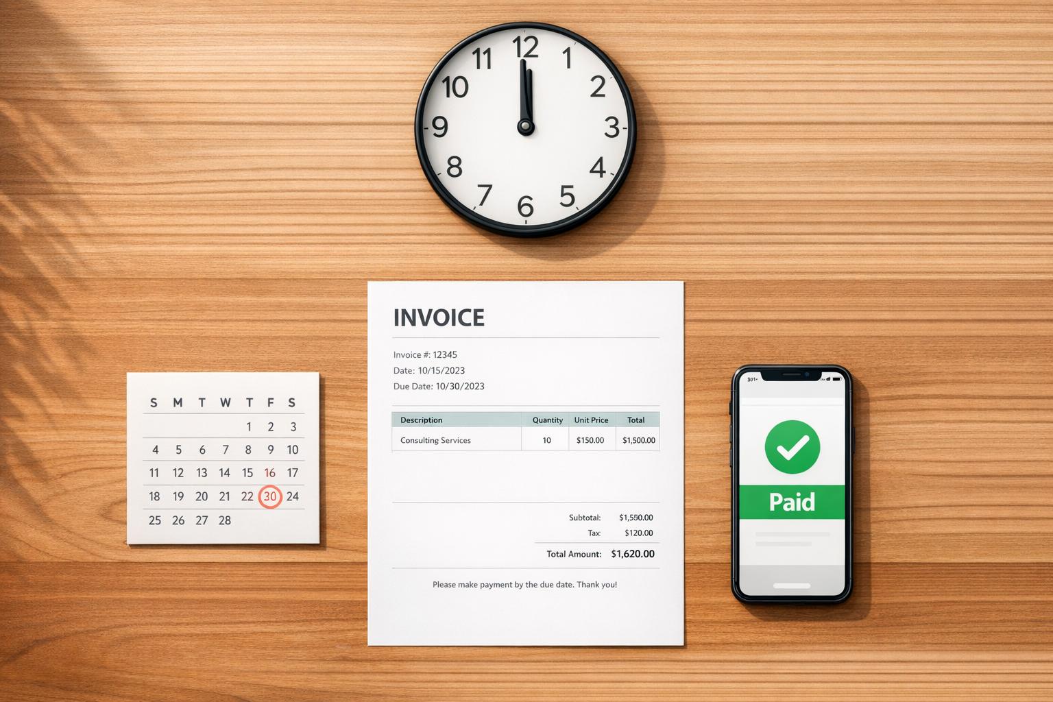 Your contract should spell out exactly when payment is due. Common terms include Net 15 (payment due 15 days after the invoice date), Net 30 (30 days), or Due on Receipt (immediate payment). Research shows that businesses with clear payment terms get paid 20% faster than those with vague or missing terms. To avoid confusion, always include a specific calendar date on your invoices, like "Due: March 15, 2026", so clients know exactly when the clock starts ticking.